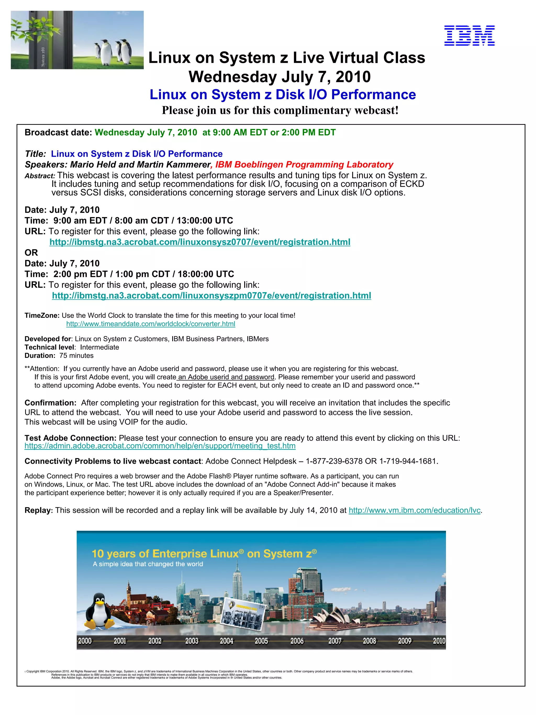 This document describes a complimentary webcast on July 7, 2010, focusing on disk I/O performance for Linux on System z, featuring speakers from IBM. It covers performance results, tuning tips, as well as comparisons between eckd and scsi disks. Registration details are provided along with technical requirements and support information.