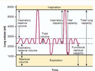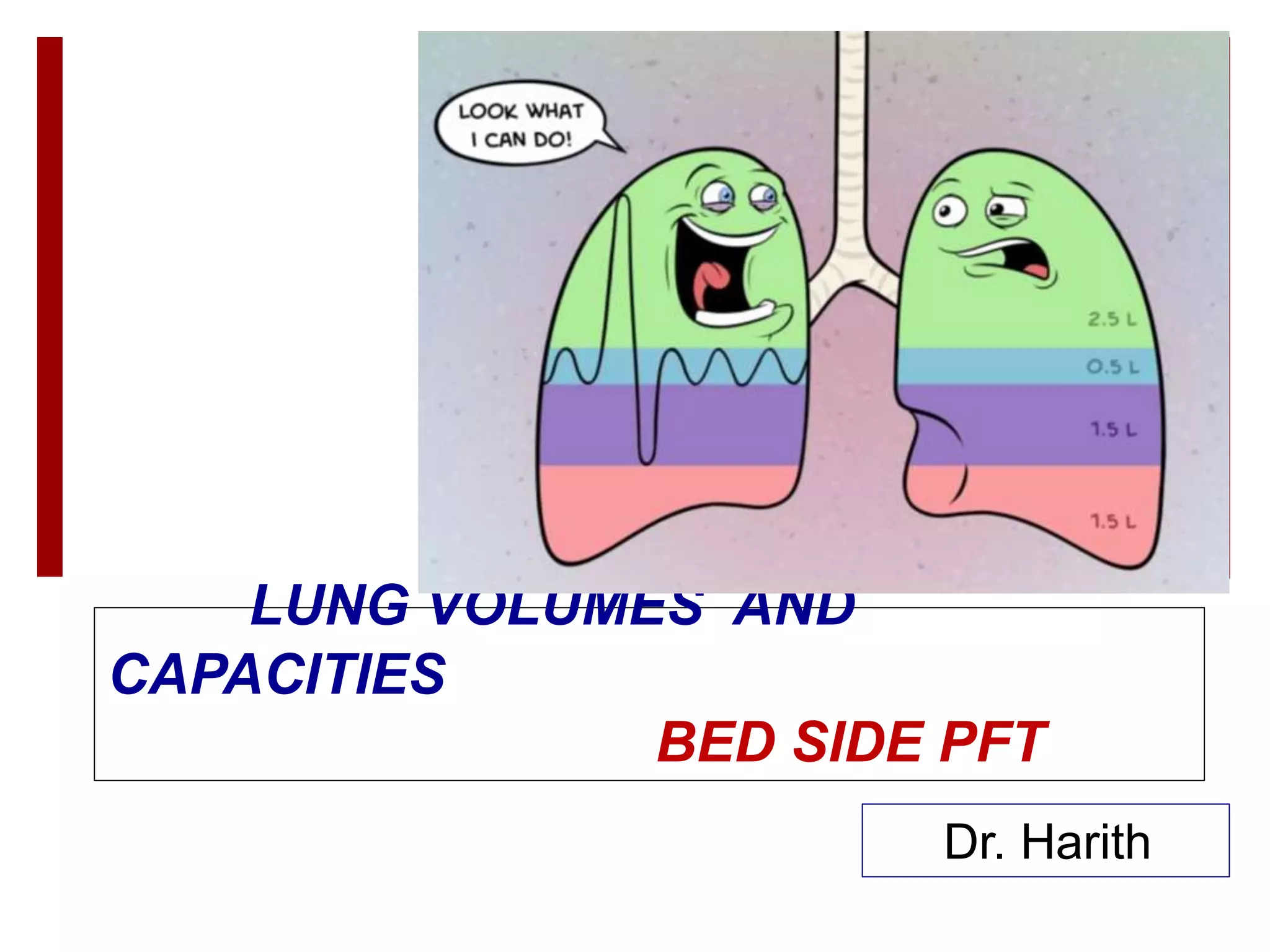 This document discusses lung volumes and capacities as measured through spirometry and bedside pulmonary function tests. It defines key lung volumes like tidal volume and residual volume. Lung capacities such as functional residual capacity and total lung capacity are combinations of volumes. Common bedside tests are described including the Sabrasez breath holding test, single breath count, modified match test, cough test, and Debono whistle test. Forced expiratory time is also discussed. Spirometry directly measures volumes while capacities are indirectly inferred.
