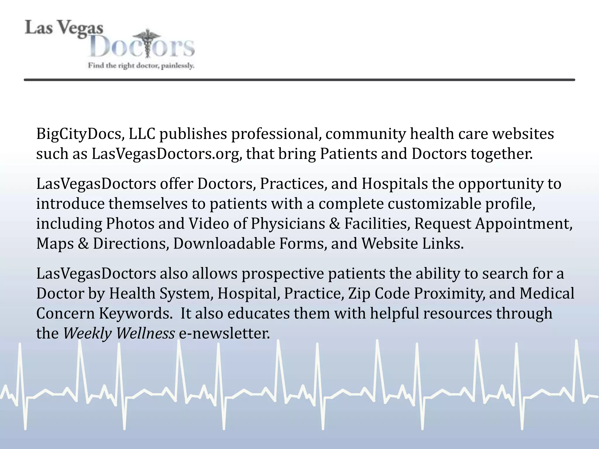 BigCityDocs publishes professional healthcare websites that connect patients with doctors. LasVegasDoctors.org allows doctors and medical facilities to create customizable profiles and patients to search for doctors by specialty, location, and medical concerns. It also provides patients with health resources through a weekly newsletter. The site aims to make finding a doctor more efficient by bringing information online.