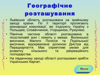 Львівська область розташованана крайньому заході країни. По її території пролягають міжнародні комунікації, які з'єднують Україну з Польщею, Словаччиною, Угорщиною, Румунією. Північна частина області розташована в лісостеповій зоні і лежить у межах Волинської височини, Малого Полісся та Подільської височини, відокремлена долиною Дністра від Передкарпаття. Має сприятливі умови для розвитку сільського та рекреаційного господарства. На південному заході області розташовані хребти Українських Карпат. Географічне розташування Меню