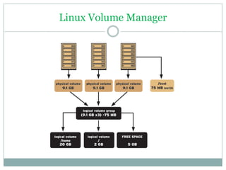 The Linux Volume Manager (LVM) maps logical volumes (LVs) onto physical volumes (PVs) through logical and physical extents (LEs and PEs). LVs are created by mapping LEs to PEs so that logical block references are translated to physical blocks. These mappings can be configured to meet goals for performance, scalability, and availability.