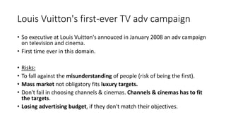 Louis Vuitton announced in January 2008 that it would launch its first television and cinema advertising campaign, marking the first time it had done so. There were risks to being the first luxury brand to engage in mass market advertising, including potential misunderstanding from consumers and not fitting luxury targets. It would also be risky to fail in choosing appropriate channels and cinemas that matched its targets and lose budget by not achieving objectives.