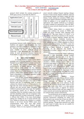 The document summarizes a proposed scheduling technique called Real Time Conflict-free Query Scheduling (RTCQS) for wireless sensor networks. RTCQS aims to increase throughput for high data rate sensor applications while supporting real-time queries. It uses a query planner to construct transmission plans for queries as sequential conflict-free steps. A query scheduler then schedules the query instances, using preemption for higher priority queries or concurrent execution when no conflicts exist. The goal is high throughput, low latency, and adaptability to varying workloads.