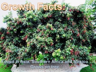 The lychee is a small fruit native to Southern China. It has a fleshy outer part surrounding a hard shell and seed. Lychees are high in vitamin C and low in calories. They can be eaten raw or used in fruit salads, desserts, and other dishes.