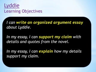 This document provides instructions for students to continue working on drafting an essay about the novel Lyddie and complete it for submission. It reminds students to use their planning pages and evidence from the novel, properly sandwiching any quotes. It notes the essay will be handed in and returned with comments that day. For early finishers, additional reading and reader's notes are assigned for homework, along with completing the book, in preparation for a quiz the next day.