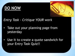 This document provides instructions for students to critique each other's work on quotes from the novel Lyddie using a "quote sandwich" format. Students are told to exchange their quote sandwiches with a partner and provide feedback based on criteria such as whether the introduction and analysis of the quote make sense. Students will then revise their own work based on the feedback before writing an essay, using quotes sandwiches to support their arguments. The learning objectives are to critique a partner's use of evidence, revise one's own work with feedback, and write an organized argument essay about the novel Lyddie.
