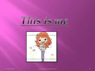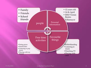 Lydia San Cayetano Payo provides information about herself including her age of 12, birthday of April 14th, school of IESO Tomás Bretón in Villamayor, and home in Villamayor. She lists her favorite things as pizza, pop music, playing with friends, and sandwiches. Her favorite free time activities are listed as listening to music, watching TV, playing with friends, playing cards, and rollerblading.