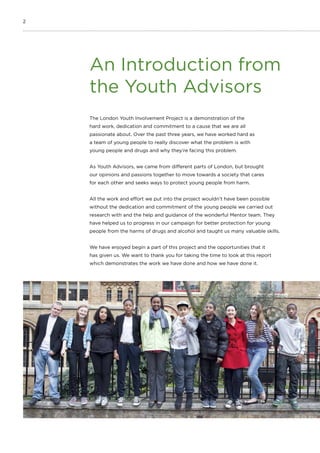 The London Youth Involvement Project aimed to bring together a group of young people from across London to ensure youth voices were included in debates around drug and alcohol prevention. Over three years, 20 Youth Advisors were recruited and trained to identify issues, research prevention topics, and deliver recommendations based on their findings. Ensuring the Youth Advisors led the project and that their ideas informed its direction was a key goal to avoid tokenism. Through activities like research and conferences, the Youth Advisors gained skills while helping to shape prevention policy and practice in London.