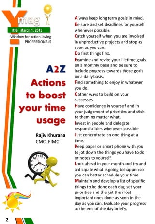 The document emphasizes the importance of effective time management for professionals, urging individuals to set long-term goals, prioritize tasks, and eliminate unproductive habits. It presents various techniques for enhancing productivity, including the use of lists, avoiding unnecessary meetings, and utilizing 'odd lot' time for meaningful activities. Additionally, it encourages a positive mindset and the enjoyment of small successes in the face of challenges.