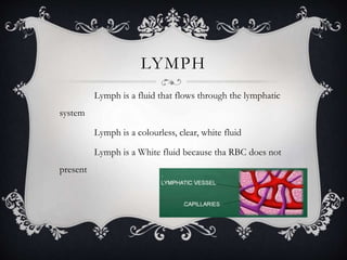 Lymph is a colorless fluid that circulates through the lymphatic system, acting as an antibody against unwanted bacteria in the body. The lymphatic system consists of lymphatic vessels, lymph nodes, and organs like the spleen and thymus, all of which help in immune response and filtering debris. It plays crucial roles in supplying nutrients, draining excess fluid, and carrying absorbed fats from the digestive system to the bloodstream.