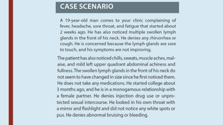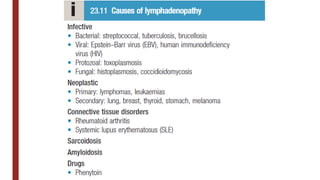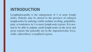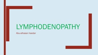 Abu-alhassn haedar presented with swollen lymph nodes. Generalized lymphadenopathy affects multiple body regions while localized is limited to a single region. Enlarged lymph nodes can be caused by infections, inflammation, or hematological diseases like cancer. Distinguishing benign from more serious causes requires determining if the lymph nodes are painful, the rate of enlargement, associated symptoms, and evaluating potential local sources of infection or inflammation. Further questions are needed to identify any alarm symptoms.