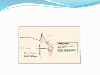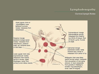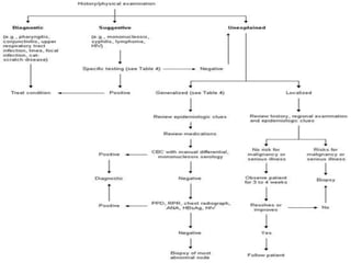 Lymphadenopathy refers to abnormal enlargement of lymph nodes. It has many potential causes including infections, cancers, autoimmune diseases, and others. A thorough history, physical exam, and diagnostic workup are important to determine the underlying cause. On exam, characteristics of the enlarged lymph nodes like their size, mobility, tenderness, and location can provide clues to potential diagnoses. Further testing may be needed but often the cause can be identified based on historical and exam factors alone.