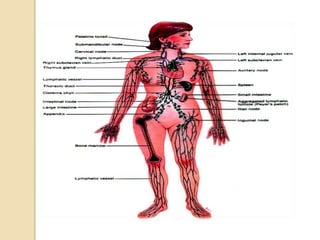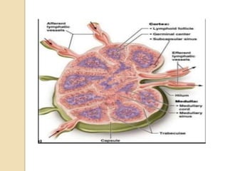 Lymphadenopathy refers to abnormal lymph nodes in size, number, or consistency. It can be generalized, involving two or more non-contiguous lymph node groups, or localized to a single group. Common causes include infections, cancers, autoimmune diseases, and medications. A thorough history and physical exam are important to evaluate potential causes and symptoms. Red flags suggesting possible malignancy include supraclavicular adenopathy, hard/tender nodes, matted nodes, and nodes that do not regress after 3 weeks or fever resolution. Careful assessment of lymphadenopathy guides further diagnostic workup and management.