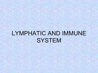 The document summarizes the lymphatic and immune systems. It describes the main structures of the lymphatic system as lymphatic vessels and lymph nodes. It then explains the main components of the immune system as lymphocytes, lymphoid tissue, and lymphoid organs. Finally, it discusses disorders that can affect these systems such as lymphangitis, mononucleosis, Hodgkin's disease, and non-Hodgkin's lymphoma.