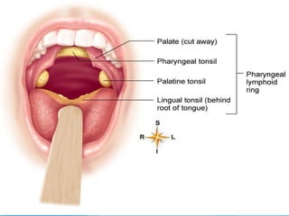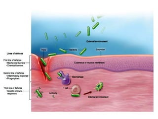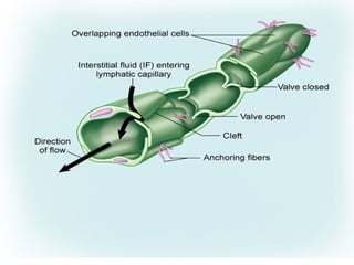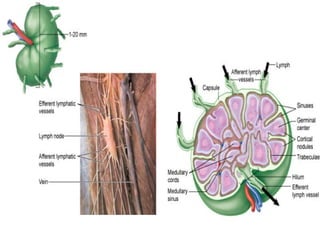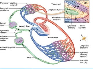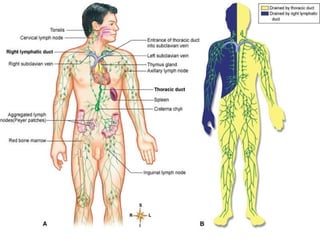 The lymphatic system maintains fluid balance, serves as part of the immune system, and helps absorb lipids. It consists of lymphatic vessels that collect excess fluid from tissues and return it to the bloodstream. The immune system protects against microbes and abnormal cells using phagocytic cells, natural killer cells, and lymphocytes. B cells produce antibodies to help fight pathogens while T cells help regulate the immune response. Together the lymphatic and immune systems work to maintain health.