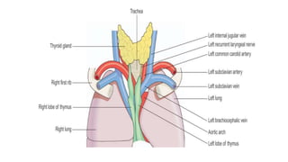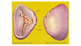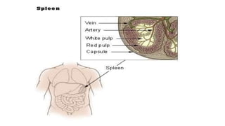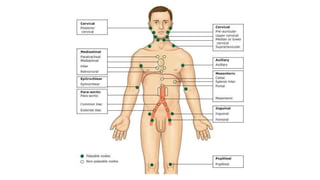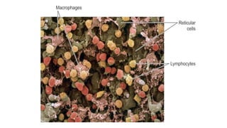 The lymphatic system helps maintain fluid balance, absorbs fatty acids from the small intestine, and fights infection. It is composed of lymph, lymph vessels, lymph nodes, and organs like the spleen and thymus. Lymph forms when interstitial fluid enters lymph capillaries and is transported through increasingly large vessels before draining into the bloodstream via the thoracic duct or right lymphatic duct. Lymph nodes filter lymph and contains lymphocytes that help fight pathogens. The spleen and thymus also aid immunity.