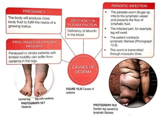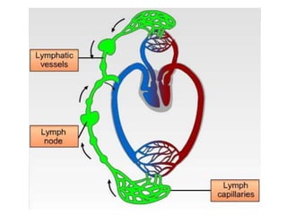 The lymphatic system consists of lymphatic vessels, lymph nodes, and organs that collect and transport lymph fluid throughout the body. Lymph fluid is formed from plasma that leaks out of blood capillaries into tissues. It collects in lymph vessels and nodes before draining into the bloodstream. The lymphatic system helps transport fat, proteins, and immune cells between tissues and blood. It also defends against disease by producing antibodies and lymphocytes in lymph nodes. Failure of lymph to drain properly can cause swelling or elephantiasis.