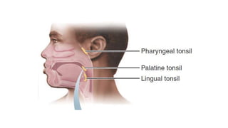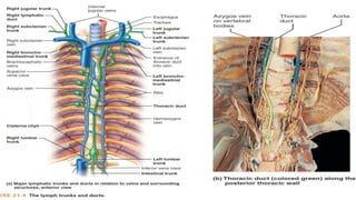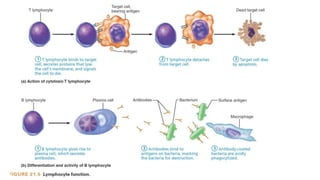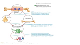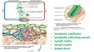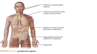 The lymphatic system returns excess tissue fluid to the bloodstream via lymphatic vessels and lymph nodes. Its main functions are drainage of interstitial fluid and participation in the immune response. The immune system protects the body from foreign organisms through fighting infections and conferring immunity.