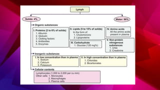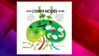 The lymphatic system transports lymph through lymph vessels and lymph nodes. Lymph nodes contain B and T lymphocytes and have three layers - cortex, paracortex, and medulla. Lymph enters through afferent vessels and exits through efferent vessels. When infected, lymph nodes swell to fight bacteria and toxins. Lymph is formed from tissue fluid, contains proteins and lipids, and returns about 120 mL to the blood per hour through the thoracic duct.