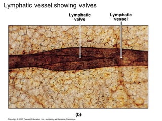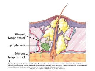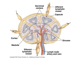 The lymphatic system defends against infection and disease by returning tissue fluid to the bloodstream. It consists of lymphatic capillaries that collect fluid from tissues, terminal ends that connect to lymphatic ducts, and lymphatic ducts that return the fluid to the venous system.