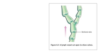 The lymphatic system consists of lymph, lymph vessels, lymph nodes, lymph organs such as the spleen and thymus, and diffuse lymphoid tissues. It works to drain excess tissue fluid, absorb fat in the intestines, and help the immune system. The lymph vessels collect fluid from tissues and lymph nodes filter out debris. The spleen, thymus, tonsils, and other lymphoid tissues help the immune response and blood cell production.
