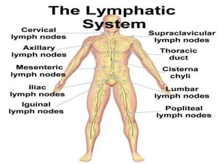 The document outlines the components and functions of the lymphatic system, which includes lymph fluid, lymphatic vessels, and lymph nodes. Key functions include returning tissue fluid to the bloodstream, transporting fats, and providing immune defense through various organs such as the spleen and thymus. It details the structure and function of lymph nodes, tonsils, the spleen, and the thymus gland in supporting the body's immune response.