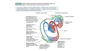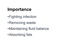 The lymphatic system helps fight infection, remove waste, maintain fluid balance, and absorb fats. It consists of lymph, lymphatic vessels, lymphatic tissue, and red bone marrow. Lymphatic vessels begin as capillaries that absorb fluid and transport it through larger vessels and lymph nodes. The spleen filters blood and stores blood cells. Disorders of the lymphatic system include lymphedema, lymphangitis, and lymphadenopathy.