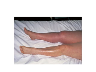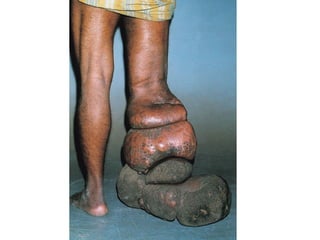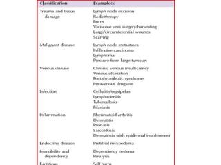 Lymphedema is abnormal swelling caused by accumulation of lymph fluid due to defective lymphatic drainage. It can be primary (congenital) or secondary (acquired after surgery, radiation, infection, etc). Symptoms include swelling, heaviness, pain and skin changes. Management involves skin care, manual lymph drainage, compression bandages and garments, exercise and rarely surgery.
