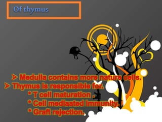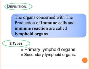 This document discusses the primary lymphoid organs - the thymus, bursa of Fabricius, and bone marrow. The thymus and bursa are the major sites of lymphopoiesis where lymphocytes mature. The thymus is located in the chest and brings about cell-mediated immunity and graft rejection. The bursa is found in birds and is the training center for B lymphocytes. Bone marrow is located within cavities of bones and serves as the "army headquarters" where red blood cells, white blood cells, and platelets are produced. It also generates lymphocytes and plays a role in lymphatic fluid circulation.