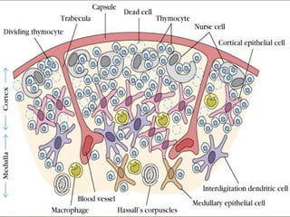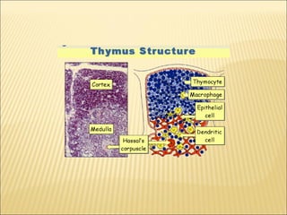 The document discusses the lymphoid organs of the immune system. It describes the bone marrow and thymus as the primary lymphoid organs, where lymphocytes develop and mature. The bone marrow is the site of generation for all blood cells including B lymphocytes, and is where B cell maturation occurs. The thymus is the site of T cell maturation and selection. Secondary lymphoid organs include the lymph nodes, spleen, and mucosal-associated lymphoid tissues, which harbor mature lymphocytes.