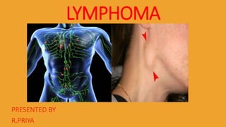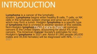 Lymphoma is a cancer of the lymphatic system that occurs when lymphocytes grow abnormally and accumulate in lymph nodes or other organs of the lymphatic system. The two main types are Hodgkin lymphoma and non-Hodgkin lymphoma. Risk factors include age, family history, immune system disorders, and certain infections. Signs and symptoms vary depending on the type but may include swelling of lymph nodes, fever, night sweats, and weight loss. Diagnosis involves biopsy and imaging tests. Treatment options include chemotherapy, radiation therapy, immunotherapy, and stem cell transplants.