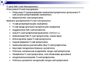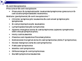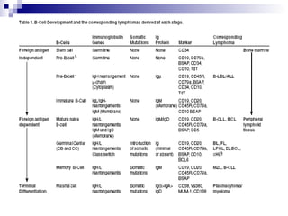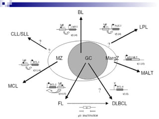 This document discusses mature lymphoproliferative disorders. It covers their classification, stages of maturation, B-cell development and lymphomagenesis. Molecular features of lymphomas include genetic alterations, infection, antigen stimulation and immunosuppression. Chromosomal translocations can activate proto-oncogenes by juxtaposing regulatory sequences. Tumor suppressor genes are also inactivated through deletion and mutation. Somatic hypermutation may introduce genetic changes involved in lymphomagenesis.