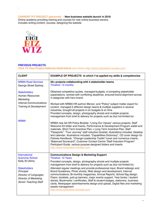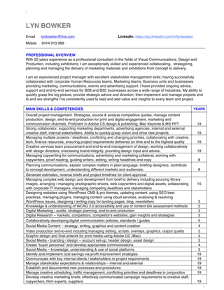 This document provides a summary of Lyn Bowker's professional experience and skills. In over 20 years as a consultant, she has managed many marketing, communications, and design projects from concept to delivery for a variety of clients. She has strong project management, collaboration, and stakeholder management abilities. Her skills include design, web development, digital marketing, video production, and social media strategy and content creation. She provides examples of projects for clients such as NRMA, International Grammar School, Goodman Fielder, Mars, and Coal Services.