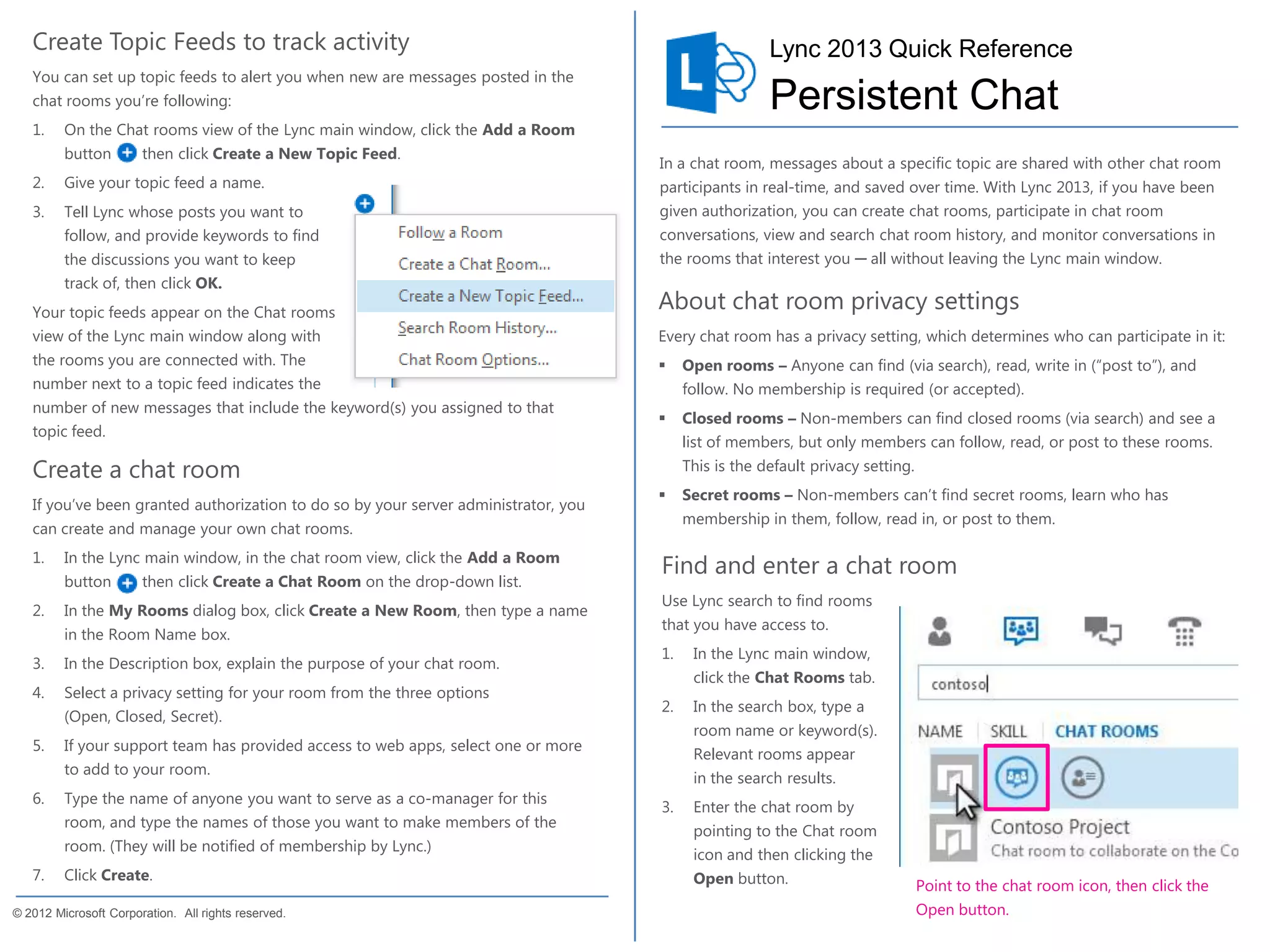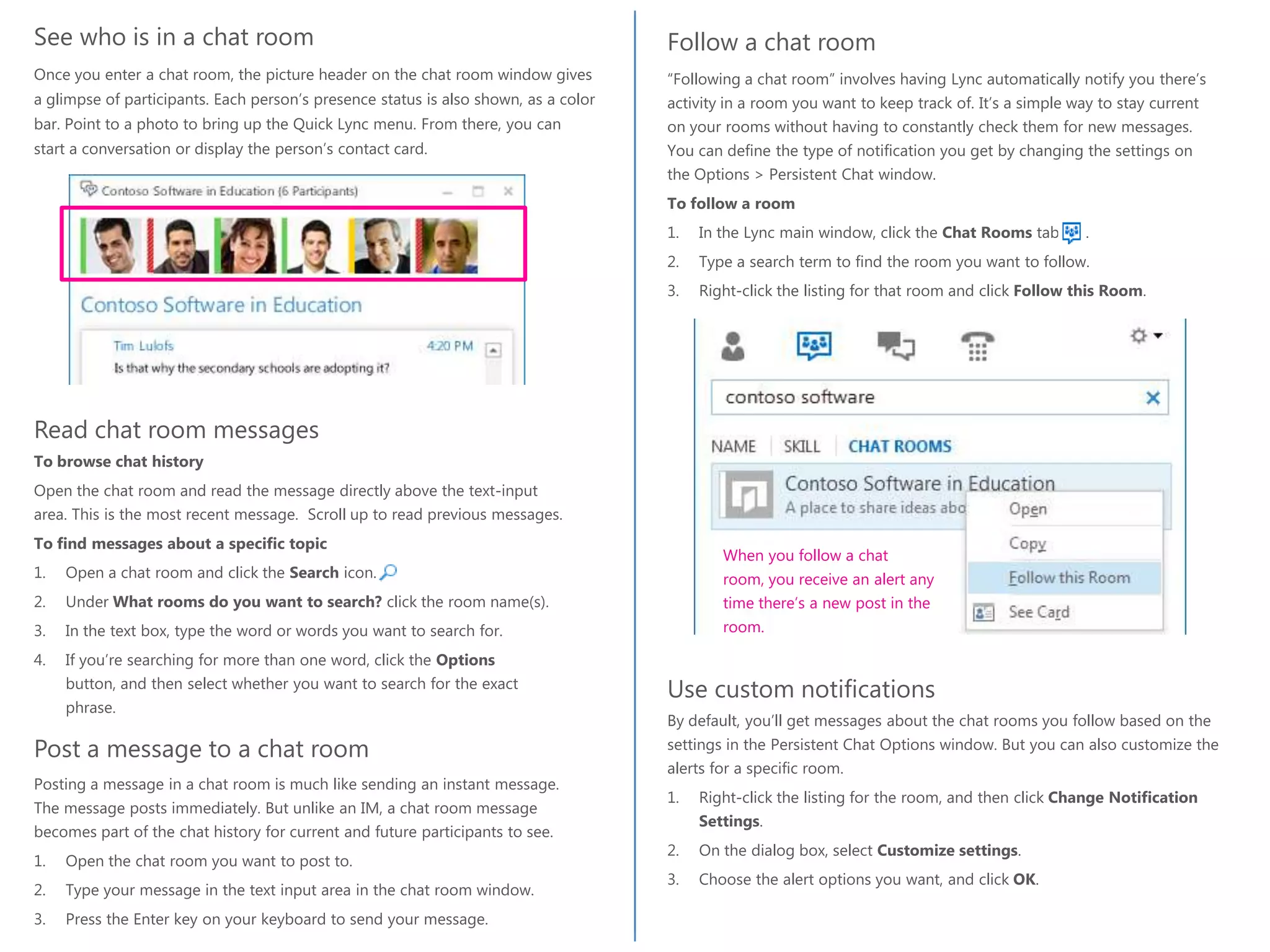 3) Users can create their own chat rooms, participate in discussions, view and search histories, and follow rooms of interest directly in Lync.
