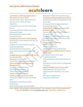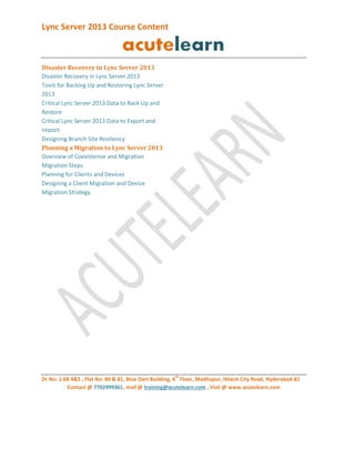 The document outlines the course content for Microsoft Lync Server 2013, covering architecture, design processes, user management, conferencing features, and troubleshooting techniques. It includes detailed planning and implementation strategies for various functionalities such as client deployment, persistent chat, and high availability. Additionally, it addresses disaster recovery planning and migration strategies to Lync Server 2013.