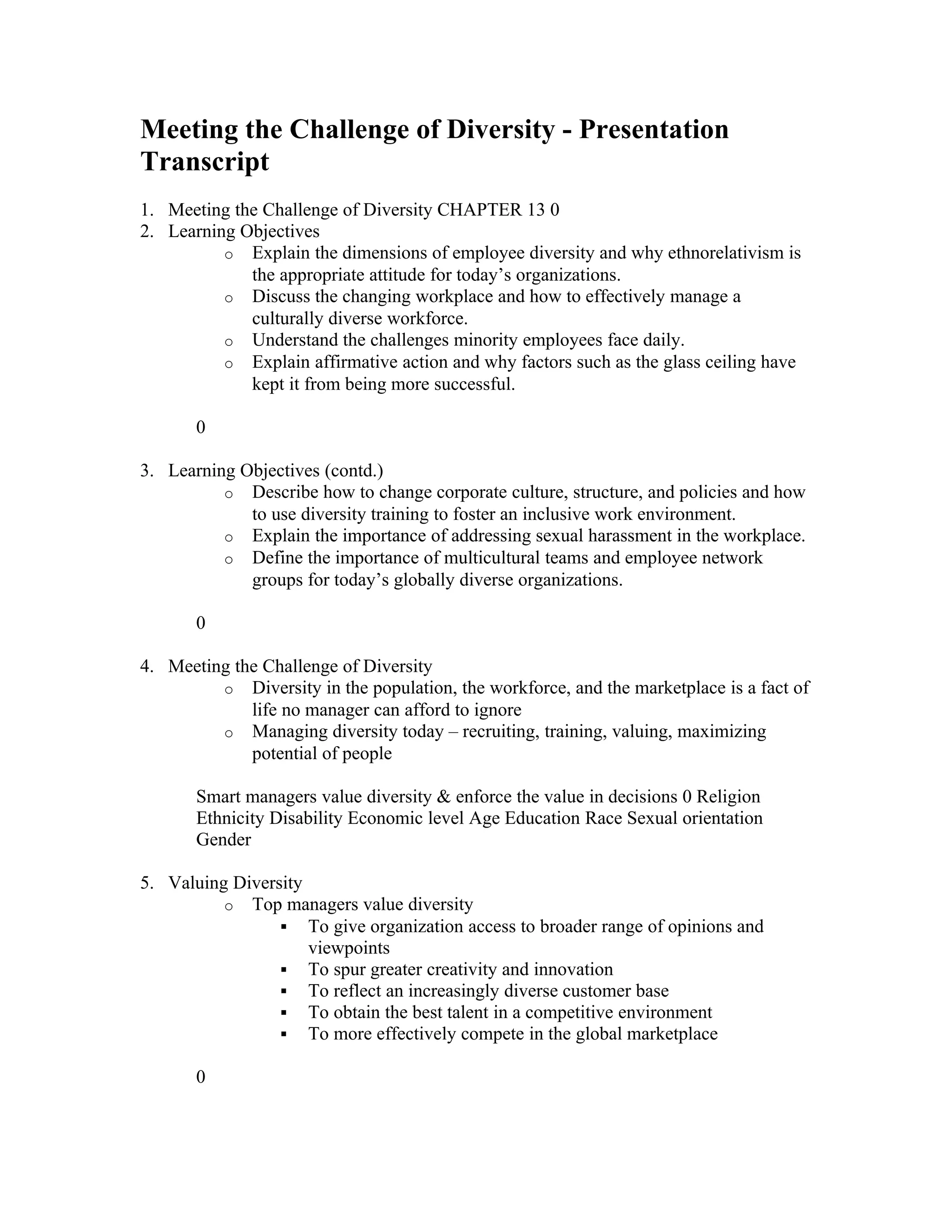 This document discusses managing diversity in the workplace. It covers dimensions of diversity including race, gender, age, and others. It explains why valuing diversity is important for organizations, such as accessing a broader range of viewpoints and reflecting diverse customer bases. However, many managers are ill-prepared to handle diversity issues. The document outlines challenges minority employees face, such as lack of choice assignments, and need for biculturalism. It also discusses initiatives organizations can take to promote inclusion, such as recruitment, career advancement programs, and diversity training.