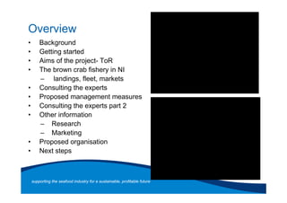 The document summarizes an industry-led strategy for brown crab management in Northern Ireland. It discusses the background of the brown crab fishery in Northern Ireland, the aims of developing a management strategy, proposed management measures consulted on with industry experts, next steps which include further consultation and developing a final management plan to be implemented in 2012. The strategy involves local management through area associations feeding into an overarching Northern Ireland Shellfish Council to deliver the management plan with support from scientists and the Department of Agriculture.