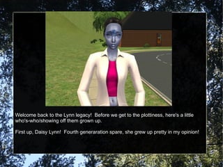 The document introduces several sim characters from different legacy families and shows them interacting in various romantic relationships. It describes Fir Lynn engaging in multiple affairs while engaged to Lyndsay London. Meanwhile, Opal and Talin plot to kidnap Fir, with Opal willing to kill Keiko and Tristessa if necessary to complete her task. The document provides an update on various storylines within the legacy community.
