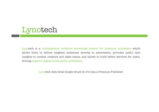 Lynotech is developing a multiplatform system that allows premium publishers to better understand their audiences through data analysis. This will allow publishers to deliver targeted advertising directly to advertisers, provide insights to improve content and sales, and build new services for users. Lynotech's solution aims to help publishers own their user data and capture more advertising revenue by selling audiences rather than just ad space. While competitors control parts of the advertising market, Lynotech's publisher-focused approach could address their needs. Initial interviews suggest publishers want solutions to understand users and sell to local advertisers, and Lynotech may have an opportunity if challenges around data sharing and ecosystem pressures can be overcome.