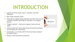 Lyocell, also known by the brand name Tencel, is a man-made cellulosic fiber produced by dissolving cellulose in an organic solvent without derivatization. It is produced from wood pulp through a solvent-spinning process using N-methylmorpholine N-oxide (NMMO) as the solvent. The manufacturing process involves dissolving cellulose pulp in NMMO, filtering the solution, extruding it through spinnerets into fibers, and removing the solvent to produce a strong yet soft fiber. Lyocell fibers have properties similar to cotton such as high strength, absorbency and softness but are more durable and easier to care for.