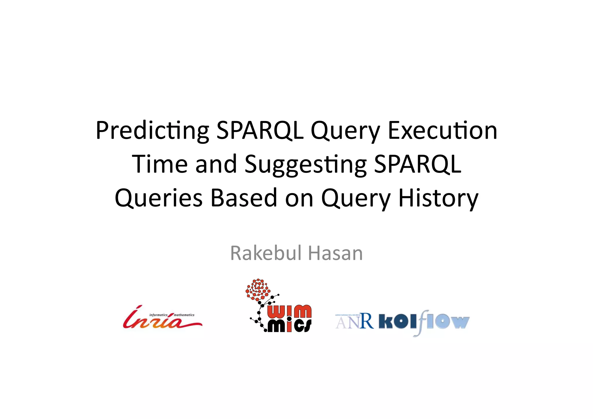 This document discusses predicting SPARQL query execution time using machine learning techniques. It first provides context on assisting users and agents in querying and consuming semantic web data. It then outlines predicting query times and suggesting similar queries from history. The document discusses applying the scientific method used for analyzing algorithms to understand query performance. It describes using machine learning to represent SPARQL queries as feature vectors to predict execution times, with the key challenge being effective feature engineering. An experiment uses support vector machine regression to predict times for test queries from DBpedia with mixed results.