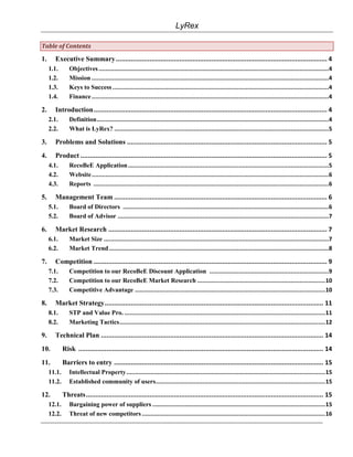 LyRex aims to change how consumers and businesses interact through its RecoBeE mobile application and website. RecoBeE allows consumers to get recommendations and reviews from other users, search for deals, and get real-time updates. It also gives businesses the ability to target customers through i-Vouchers. LyRex sees problems in how merchants reach customers and how customers make decisions without real-time information. It aims to solve this by creating a community where users can share information and find the best deals and recommendations. Within 3 years, LyRex expects to have 58,000 customers and $1.88 million in sales with a $1.1 million profit by leveraging mobile social networking.
