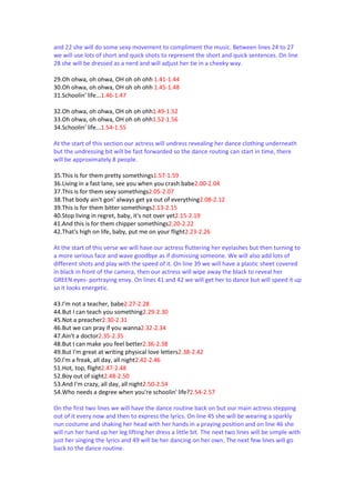 This document provides direction for a music video shoot featuring a female actress. It outlines specific shots and actions for certain lyrics. For example, in line 2 the actress will blow bubbles to portray time moving fast, and in line 12 the camera will focus on her shoes and then pan up her body. Throughout the video different costumes and settings will be used, and techniques like fast forwarding, close-ups and dance routines. The goal is to have the actress' movements complement and emphasize the beats and meaning of the lyrics.