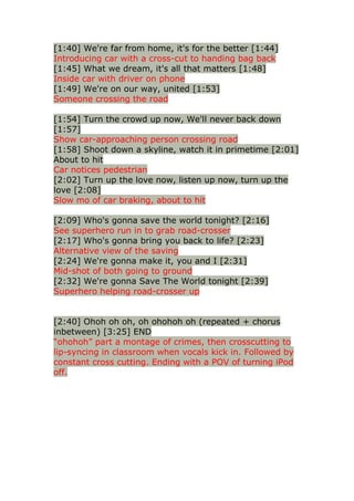 The breakdown annotates the lyrics of the song section by section over 3 minutes and 25 seconds, describing scenes of a superhero running through urban and suburban areas, fighting crime, saving a pedestrian from being hit by a car, and ending with turning off an iPod. It provides descriptions of shots that correspond to the lyrics about being a superhero fighting crime and saving the world.