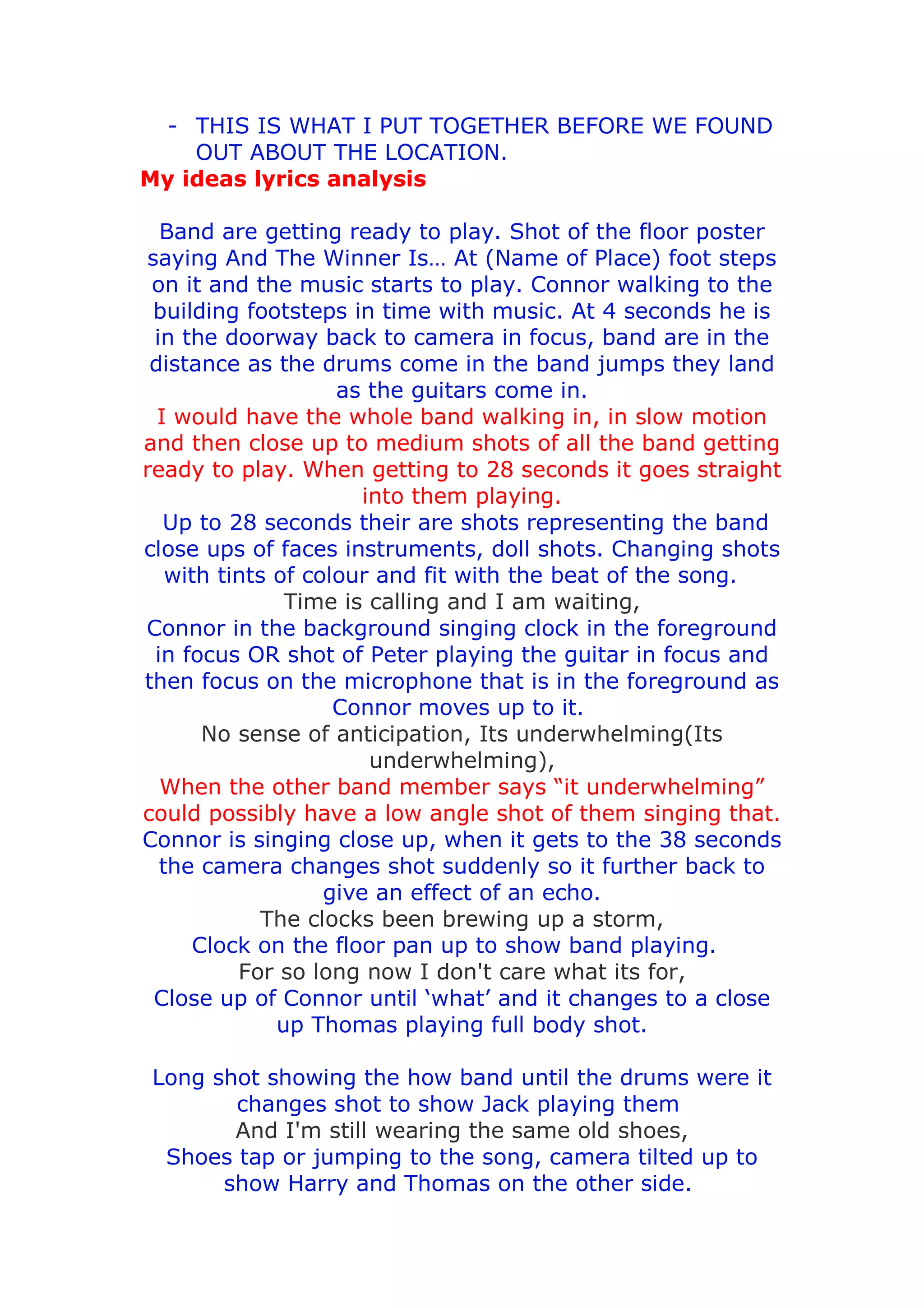 This document provides a shot-by-shot storyboard for filming a music video for a band. It describes various camera shots and angles to depict the band getting ready to play and then performing their song, including close-ups of band members' faces and instruments, shots showing their movements and stunts, and shots that change or move with the beat of the music. The storyboard aims to capture the emotion and story of the song through visually interesting shots that fit with the lyrics and music.
