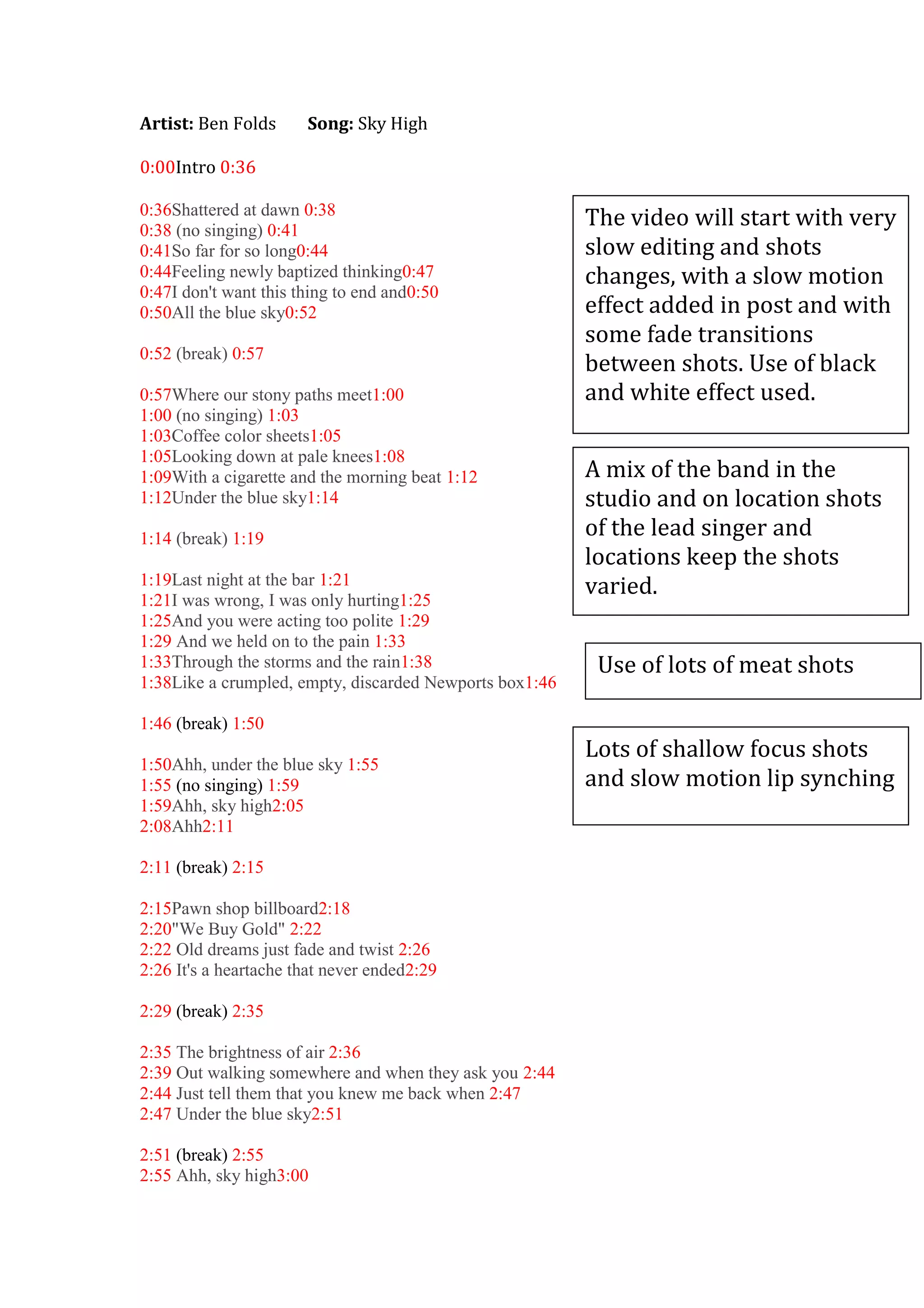 The document provides details on the song "Sky High" by Ben Folds. It describes the video for the song as having a slow, black and white aesthetic with slow motion effects. Scenes will include shots of the band in the studio and on location. Close-up shots and slow motion lip syncing will be used. The video will have a melancholy, reflective tone to match the lyrics and mood of the song.
