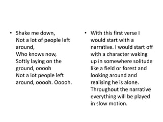 This document outlines lyrics and plans for a music video narrative. The narrative follows a character who wakes up alone in nature and is chased by threatening figures. Throughout the song and video, the scene cuts between the artist singing and the character being pursued in slow motion. Near the end, the character faces the camera in a close-up before turning back to the figures and running toward them, at which point the video ends in a flash of white. The lyrics and video are intended to tell a story through this repeated motif of the character waking alone and being chased.