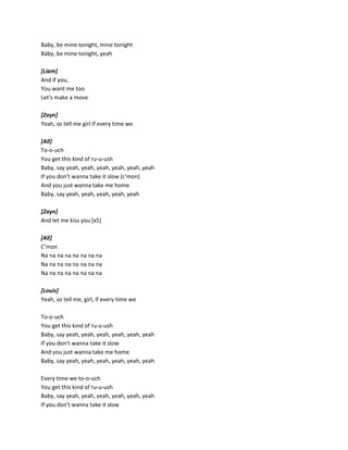 This document contains the lyrics to the One Direction song "Kiss You". The song is about wanting to be intimate with a romantic partner. It describes taking the partner anywhere they like and making moves to be together. It asks if every time they touch the partner gets "this kind of rush" and if they want to take things fast rather than slow. The chorus repeats asking the partner to say "yeah" if this describes how they feel.