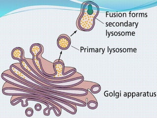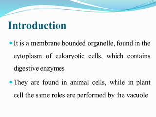 Lysosomes are membrane-bound organelles found in animal and plant cells that contain digestive enzymes. They were discovered in 1955 and play key roles in breaking down materials through autophagy, heterophagy, cell death pathways, and more. Lysosomes produce hydrolase enzymes and maintain an acidic interior environment needed for enzymatic reactions. They receive enzymes from the endoplasmic reticulum and Golgi apparatus and digest extracellular and intracellular cargo through membrane fusion events.