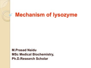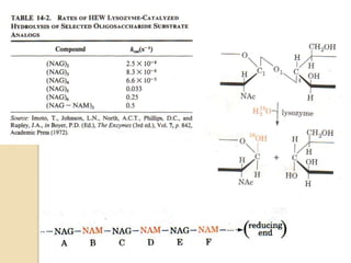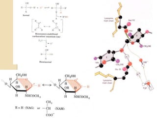 Lysozyme digests bacterial cell walls by breaking bonds between N-acetylmuramic acid and N-acetylglucosamine. It attaches to a hexasaccharide unit in the cell wall. Glucose 35 transfers a proton to cut the bond, generating an oxonium ion stabilized by Asp 52 via charge interactions. The product is released as the glycosyl-enzyme intermediate adds water.
